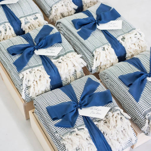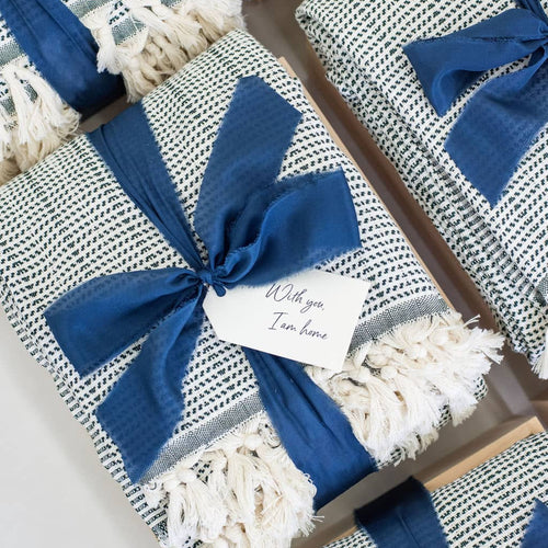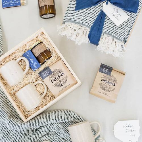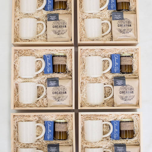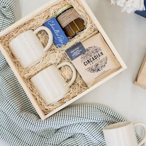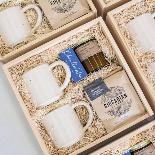 The gift design began with a natural pine box, filled with soft wood shreds that added warmth and texture to the presentation. Inside, we included a custom notecard and a carefully curated selection of cozy, elevated items: a pair of ceramic coffee mugs in soft, neutral tones, a bag of locally roasted coffee beans, an artisan soy candle, and a branded box of matchsticks to complete the ambiance. To top it all off, a luxuriously soft Turkish throw blanket was neatly folded over the gift box, tied with a coordinating satin ribbon and finished with a custom gift tag for a polished, thoughtful touch.