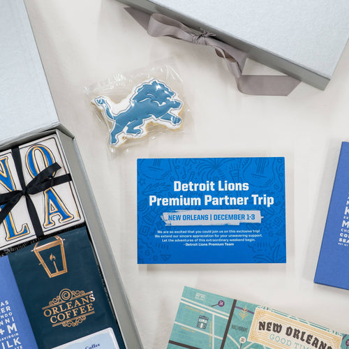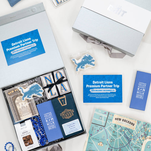 Our goal was to create a “wow” gift experience for the Premium Partners of the Detroit Lions to enjoy during their visit to New Orleans. We aimed to reflect the spirit of the Detroit Lions through a cohesive use of their color palette and branding, while thoughtfully blending into the rich culture and character of New Orleans.
