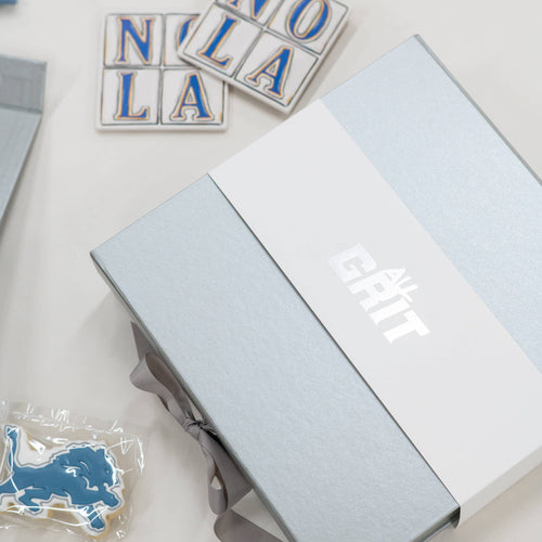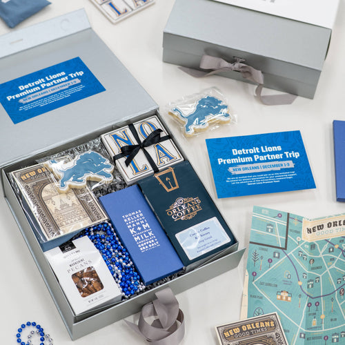 We designed this gift to feature a sleek custom-branded silver foil bellyband, paired with a personalized notecard to create a polished and memorable unboxing experience. Inside, we carefully arranged a thoughtful selection of items that blended both personalization and regional charm. Blue and silver accent beads added a festive touch, while a custom Detroit Lions cookie brought a playful, branded element to the assortment. We also included small-batch artisan pecans, a custom amenity kit for practical luxury, and a set of two New Orleans-inspired tile stone coasters that offered a stylish nod to the city’s unique design culture. To round out the experience, we infused the gift with New Orleans flair by including a detailed travel map and culture guide, perfect for exploring the city or simply appreciating its rich history. An artisan milk chocolate bar and a locally sourced historic chicory coffee blend provided a delicious taste of the region, giving the recipient both comfort and a warm welcome to the city.