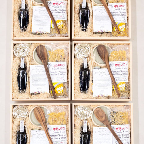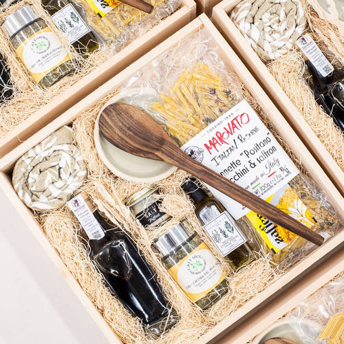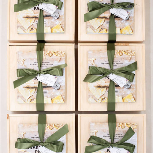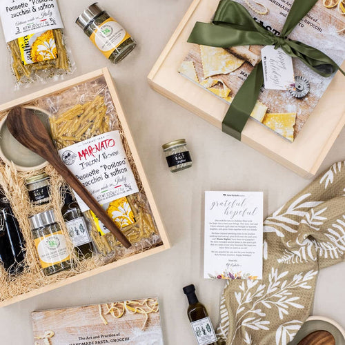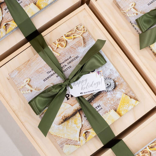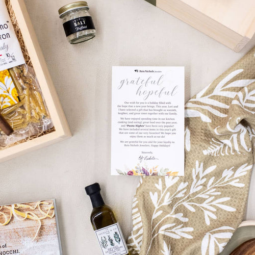 A custom slide-top wood box was chosen as the vessel for this luxe, Italian-inspired gift. Inside, recipients discovered gourmet treats like mini truffle salt, linguine pasta with pesto, aged balsamic vinegar, dried dipping herbs, and Tuscan herb-infused olive oil, perfect for a special meal shared with family or enjoyed solo. Artisan cooking tools, including a handmade ceramic spoon rest, an acacia wood spoon, and an olive-colored tea towel, elevated the experience. To complete the gift, a dried wheat accent was placed inside, and a pasta recipe book was tied to the top with satin ribbon and a custom gift tag. A personalized notecard from Reis-Nichols was included inside, sharing a heartfelt message and the story behind each thoughtfully chosen item.