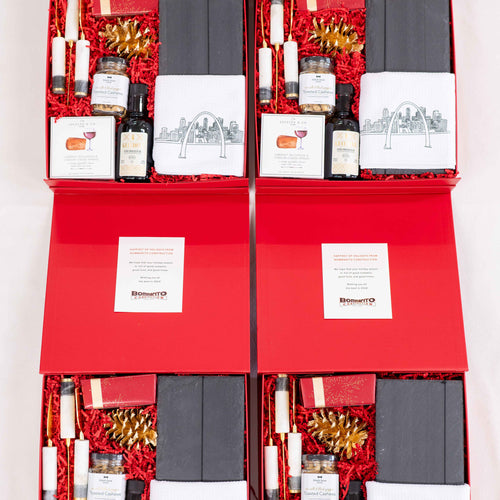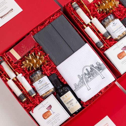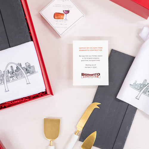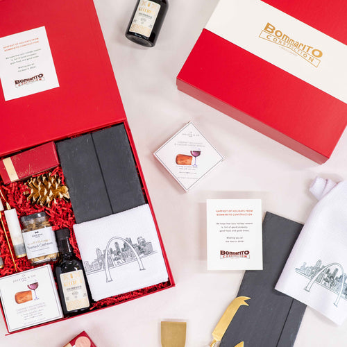 We kicked off this luxurious charcuterie-themed gift with a slate cheeseboard paired with a marble and brass cheese knife set—elegant essentials for any upscale spread. For savory delights, we curated artisan extra virgin olive oil, a rich cabernet sauvignon & cheddar cheese spread, and perfectly toasted cashews. To satisfy the sweet tooth, we added a selection of assorted chocolate truffles. As a thoughtful finishing touch, a St. Louis tea towel offers a charming nod to the city where their headquarters are located. This was all wrapped up in a beautifully festive red gift box, with a custom branded belly band and notecard.