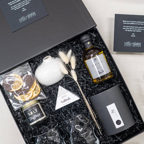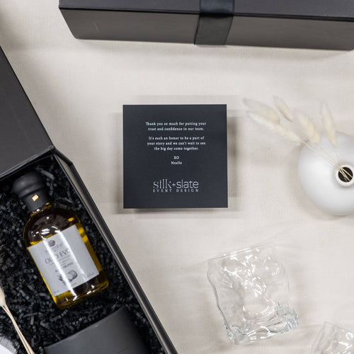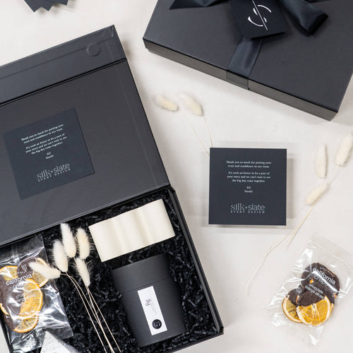 We developed two thoughtfully curated gift tiers for Silk & Slate to gift their clients. The first tier included a matte white ceramic bud vase with a delicate bundle of dried white bunny tails, paired with two textured crinkle cocktail glasses perfect for celebratory toasts. Gourmet treats such as truffle salt and chocolate orange crisps added a luxurious touch, alongside indulgent essentials like black lava sea salt bar soap and truffle-infused olive oil. This tier was completed with a custom-branded glass candle and a personalized notecard and tag for a refined finishing touch. The second tier offered a carefully selected collection featuring the rich black lava sea salt bar soap, a handmade ceramic wave trinket tray with elegant organic lines, and the same chocolate orange crisps and branded glass candle. This tier was also finished with a custom gift tag and notecard, secured with satin ribbon for a polished, sophisticated presentation.