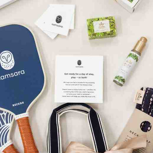 As gift packaging, we chose the perfect pickleball bag that was large enough for a change of clothes, paddles, and water bottle, but still portable enough to sling over the recipient's shoulder. Made from heavyweight cotton-blend canvas with leather accents, it was the perfect bag to tote the neutral colored pickleballs, customed logo set of pickleball paddles, Four Seasons branded hat, and Apple Watch and band for a fun afternoon out on the court. Don’t worry, a therapy neck-wrap and local Hawaiian spa products were also included for that much needed recovery after. This was all tied up beautifully with a neutral satin ribbon and custom logo gift tag, ready to warmly welcome trip recipients to the beautiful Hawaiian island of Lana’i!
