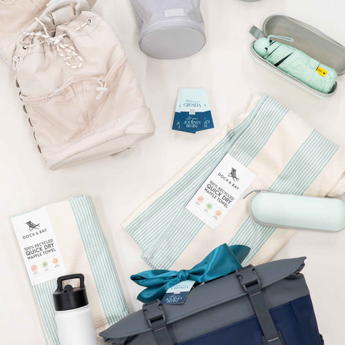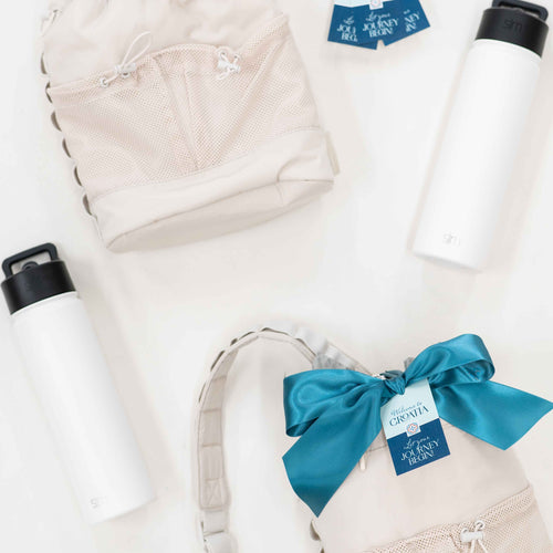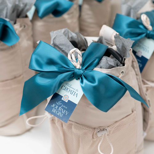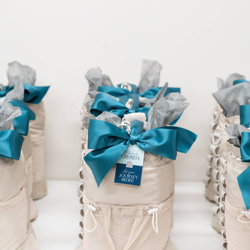 We wanted to stay true to the brand’s aesthetic as well as highlight the beautiful destination of Croatia with these outdoors inspired gift bags. All of the gift items, including the gift vessel itself, were reusable and would be helpful items to use during the trip as well as being keepsakes to take home and use many times in the future. The tier one gifts were Yeti brand backpack soft coolers that contained two quick dry towels, two Dagne Dover brand roll-top dry bags, two mini travel umbrellas, two Dagne Dover brand sling bags and travel water bottles. The tier two gifts were two Dagne Dover brand sling bags that contained travel water bottles that were perfect for packing for a day of hiking or sightseeing around Croatia. Each gift has a custom notecard, and the same bright teal ribbon tied with a custom gift tag to each tote bag.