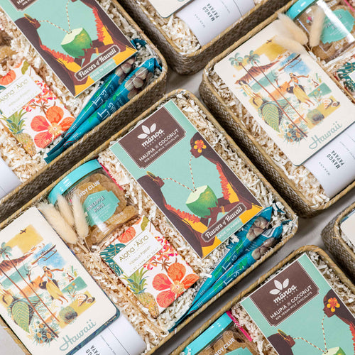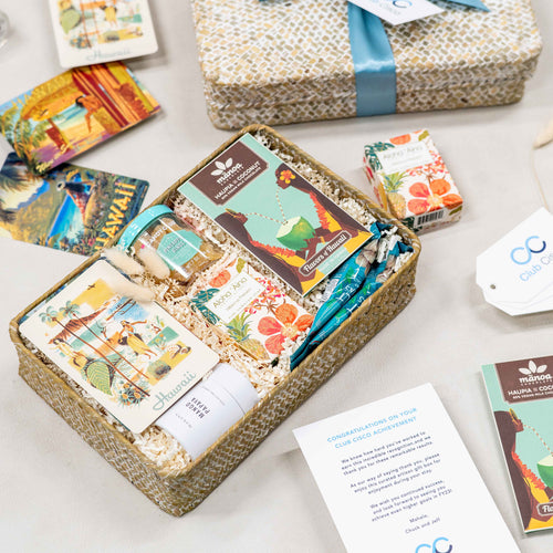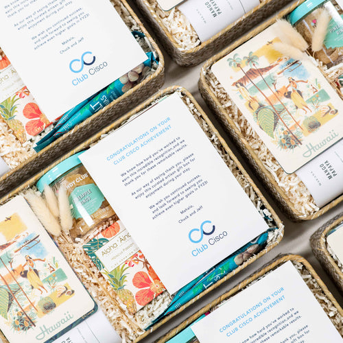 Sales executives earned a week-long beach vacation so we packed these Hawaiian beach-themed baskets full of locally sourced treats that all guests could enjoy on their trip and get a taste of the Hawaiian Islands with macadamia nuts, pineapple rings, and more. We also included keepsake items to honor their hard work and for them to remember their trip, including vintage inspired Hawaiian postcards, small batch candles, and more. The Hawaii inspired gift contents were travel-size because all the recipients traveled to the destination and would have to fly home again, as well as being gender neutral so that all guests felt included and appreciated.
